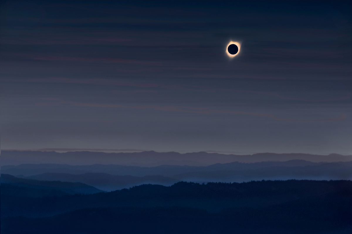 View of the total eclipse from 2017 over the mountains near Madras, Oregon. This image works best when printed on metal as that was it can better capture the light of the corona.